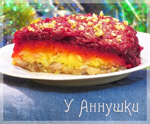Проект "Салат под шубой" Уже на столике или перед самой подачей режем салатик как тортик или холодец, на приблизительно одинаковые куски.