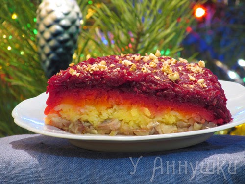 Новогодняя селёдка "под шубой" готовится слоями.